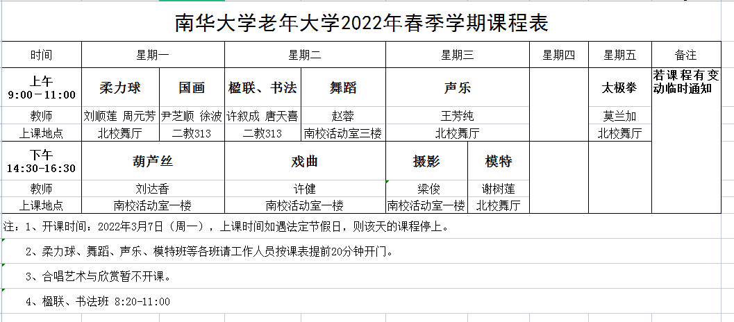 老年大学2022年春季学期课程表