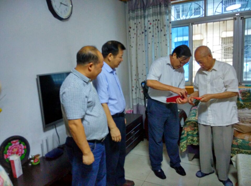 在中国人民抗日战争暨世界反法西斯战争胜利70周年来临之际,按照学校党委统一部署,校党委书记邹树梁,副校长龚学余、刘升学带领离退休工作处负责同志前往抗战老同志家中,开展走访慰问活动。校领导向抗战老同志转达了党和国家,以及省委、省政府对抗战老同志的关心和问候,向抗战老同志转交了由中共中央、国务院、中央军委颁发的“中国人民抗日战争胜利70周年”纪念章,送去了专项慰问金,并代表校党委、校行政向老同志致以崇高的敬意和亲切的慰问。