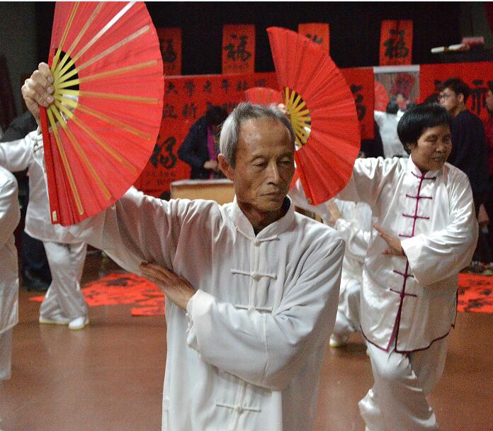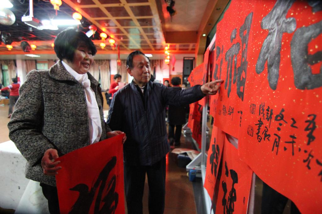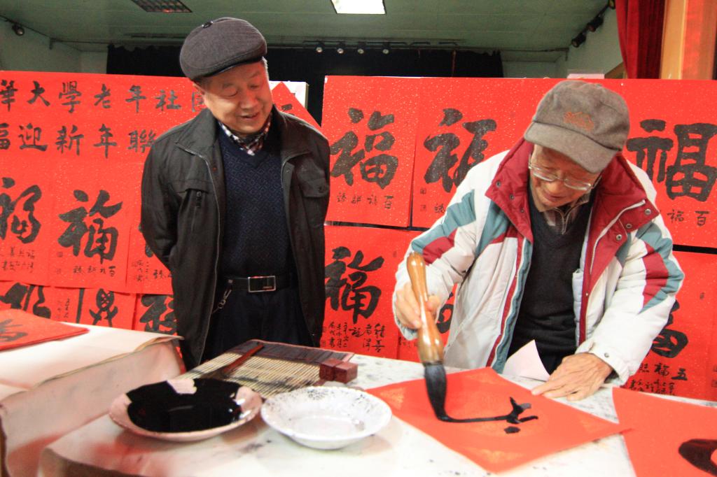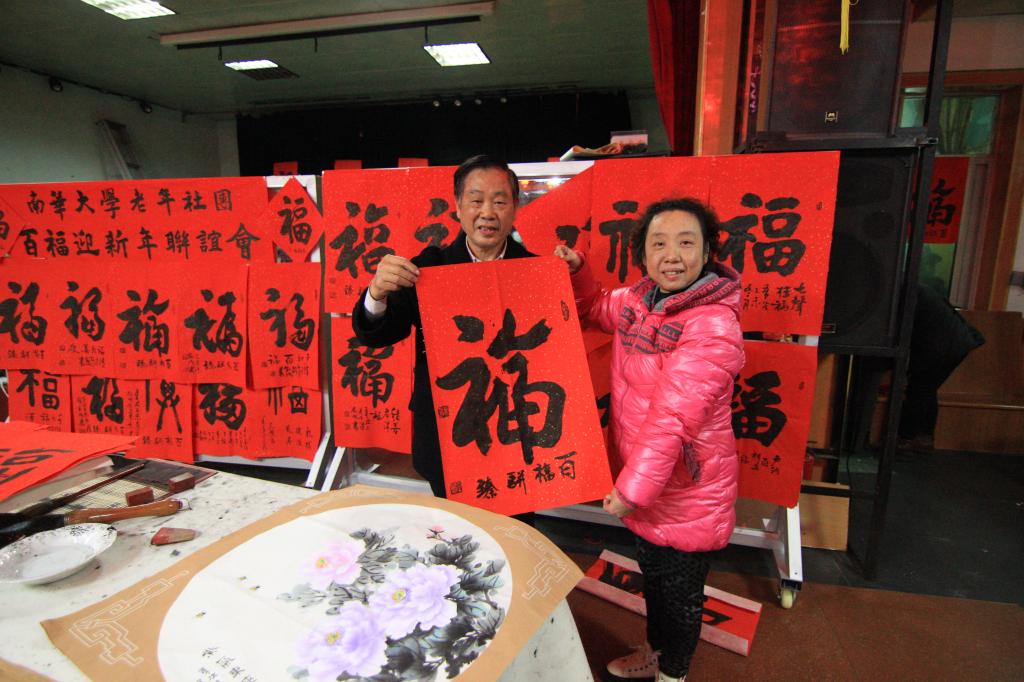 为了准备这场联谊会,三个团体组织精心策划,准备了很多精彩的节目。活动现场,会员们自导自演、载歌载舞,有太极拳、广场舞、柔力球、太极剑、歌伴舞、独唱、诗朗诵,等等,现场气氛热烈欢乐。书法协会的会长许叙成带领书画爱好者现场写字、作画,表达对新年的祝福、对生活的热爱。只见老年书画协会的会员们提笔挥毫,或楷或草,一个个“福”字,满载着祝福,跃然于纸之上。活动现场布满了“福”字,会员们也纷纷在“福”字前合影留念。每一位到会的会员都可以领取一个“福”字,也可以邀请书画协会的老师现场写下自己喜欢的“福”字带回家。
