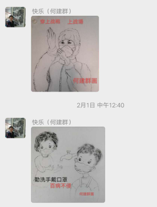 退休党员何建群素描作品《穿上战袍上战场》、《勤洗手戴口罩》。