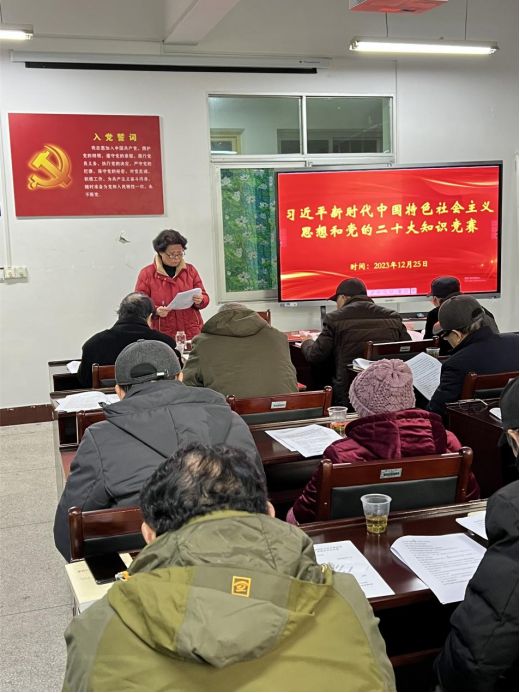 支部围绕习近平新时代中国特色社会主义思想论述、党的二十大报告、党章、党规等内容,精心选择了110道问答题,编辑成人手一份的知识手册,事先发给大家学习。根据老同志年龄大、反应慢等特点,采取由支部委员周爱莲组织、全体党员参与必答宣讲的形式开展竞赛。