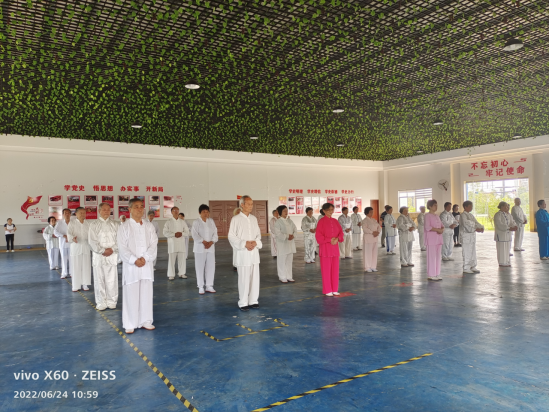 2022年6月24日上午9:00我校老年太极拳协会共计50名会员在学校东大门集中,分别乘坐两台大客车去珠晖区金甲岭水师山庄开展太极拳等展演活动。