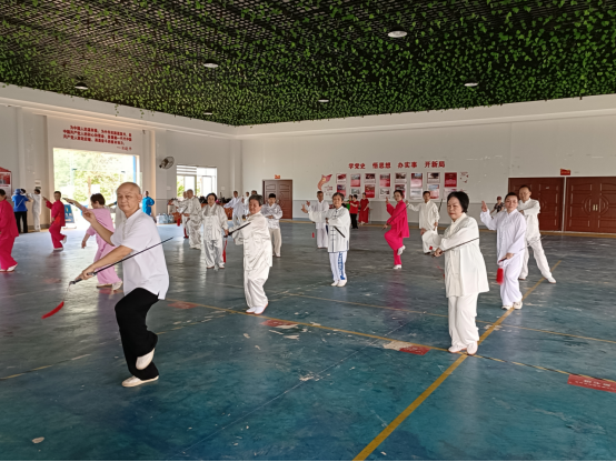 到目的地后,先后进行了柔力球表演、八段锦表演、24式太极拳表演、32式太极剑表演、第二套功夫扇表演、八法五步表演和个人展演。