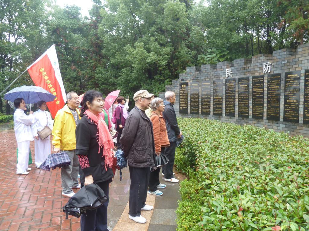 虎形山人防公园入口处有一块百余米的广场,广场中心嵌有太极阴阳图,广场平整,依山傍水,环境幽雅,是演练太极拳的理想场地。会员们冒着细雨伴随音乐演练了太极拳集体套路,随后,参观了公园里展示的人防主题文化。