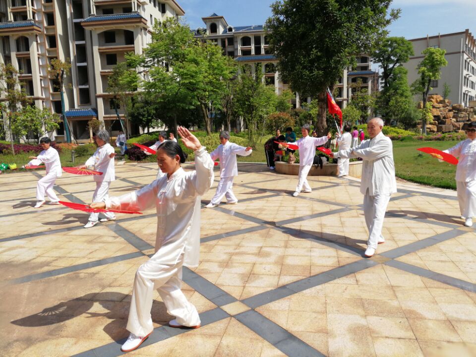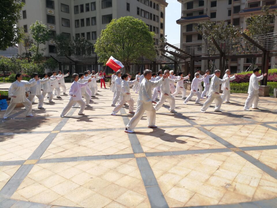 颐和苑风景秀丽,小桥流水,绿草如茵,高楼林立,喷泉涌动,一派和谐安宁的氛围。在一个小广场,全体会员首先集体演练了24式简化太极拳,接着又打了32式太极剑。之后分小组表演了杨氏36式太极扇、陈氏36式太极拳,以及陈氏24式混元太极拳等。温馨的春日,舞动着优美的节律,大家积极展示着各自的风采,为春日里的颐和苑增添了一抹亮丽的风景。