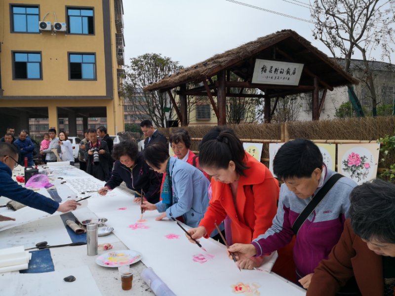 先是乘观光车游览了村容村貌,美丽的乡村风景令人陶醉。随后开展现场书画创作。老年书画协会骨干20来人,以及特邀嘉宾,衡阳市多位知名书画家齐上阵,持续3个多的现场创作共创作书画作品近百件,分别赠送给梅花村两委、接待笔会的饭店、当地老百姓。