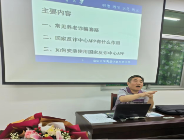 会议由支部书记贺性鹏主持。他精心制作了《老年人防诈骗专题宣传》PPT,详细解释“毁于一蛋”、“房不剩房”、“游尽灯哭”、“资虚乌有”、“急不可代”、“药缠万贯”和“子作多情”等7个新成语内涵,通过三个具体的诈骗案例介绍了常见养老诈骗套路,强化了老同志防诈骗的意识,提高了老同志辨别诈骗信息、电话的能力。