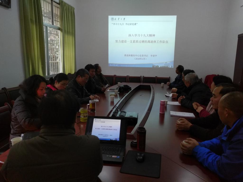 为深入学习贯彻党的十九大精神,扎实推进“两学一做”学习教育常态化制度化建设,进一步用习近平新时代中国特色社会主义思想武装头脑、指导实践、推动工作,2018年1月22日下午2:30离退休服务中心党委在党员活动室举行了一场“学习十九大 书记讲党课”活动。